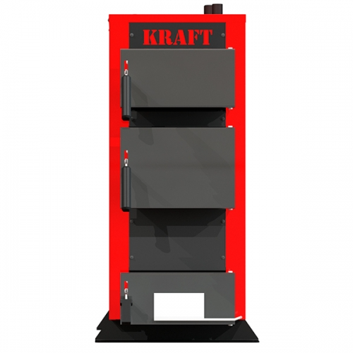 Твердопаливний котел KRAFT E New – опалювальний агрегат з двоходовим теплообмінником та водяними колосниками. Не залежить від електрики. На одному завантаженні працює 6-12 годин (залежно від палива, що використовується).